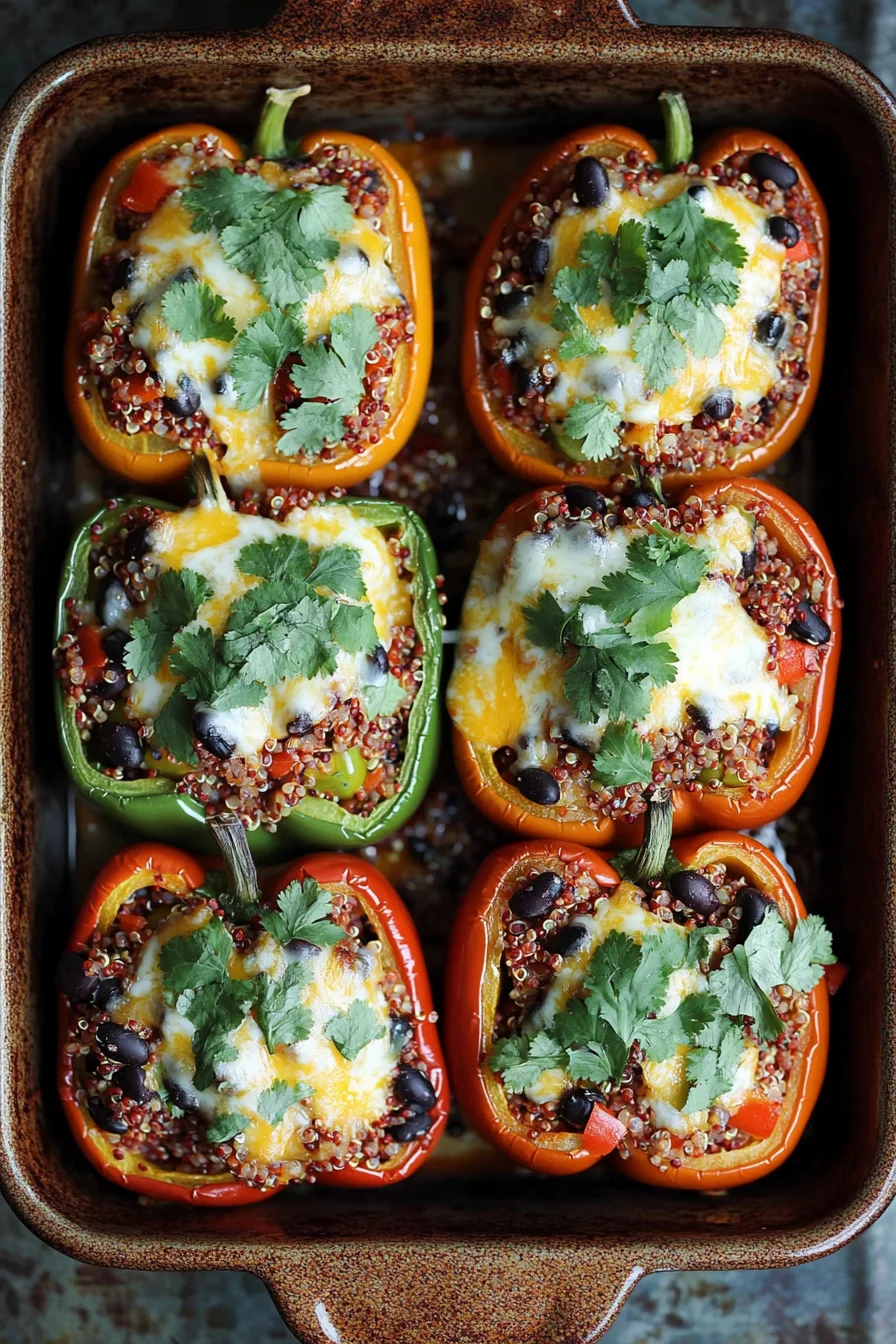 - Fill each pepper half with the quinoa mixture, pressing gently to pack the filling.